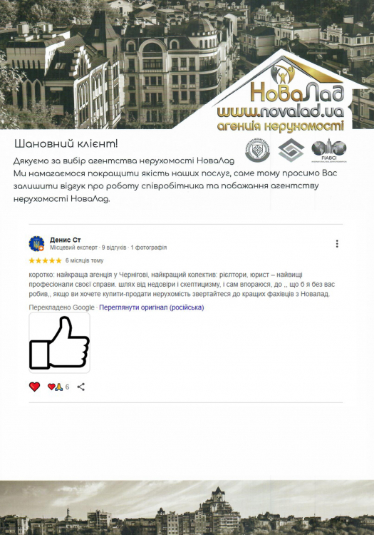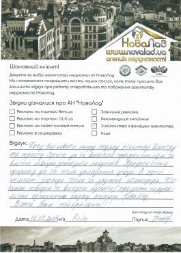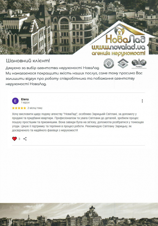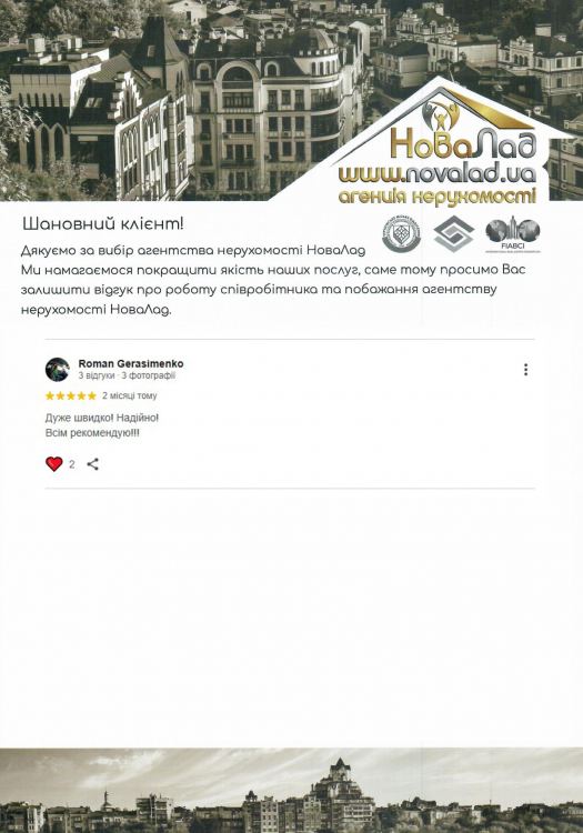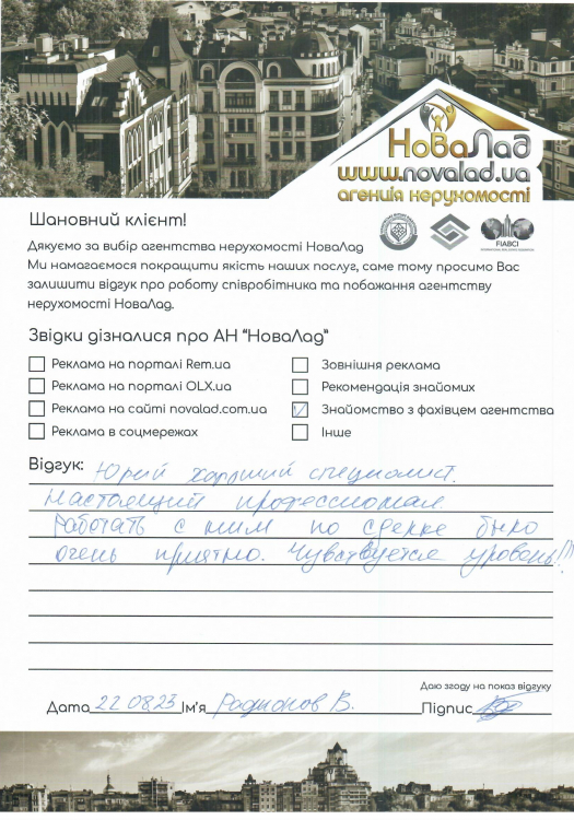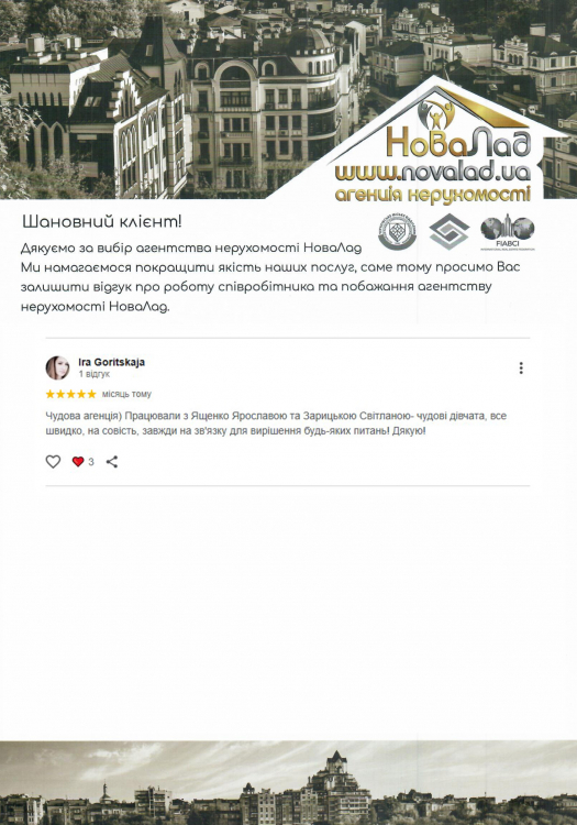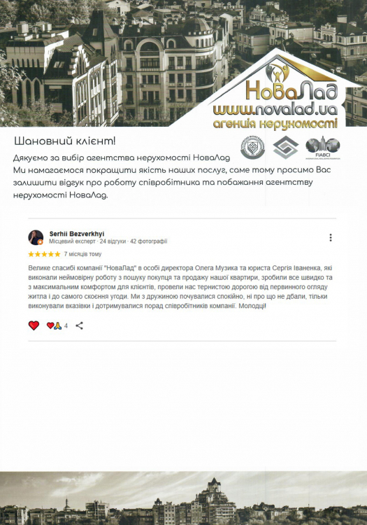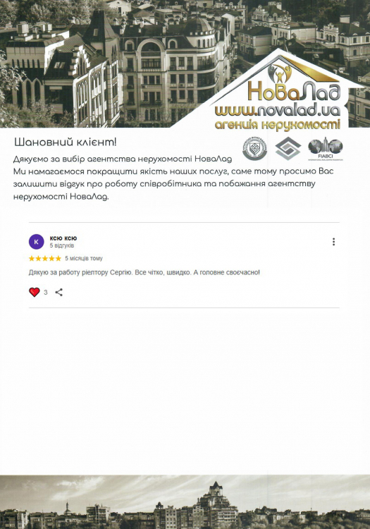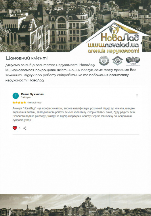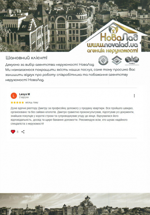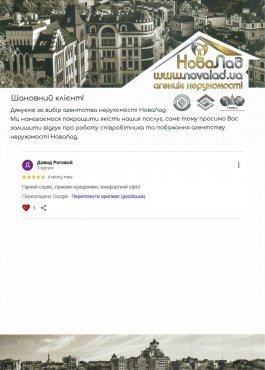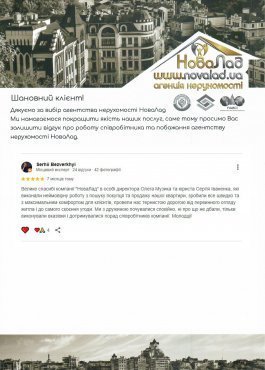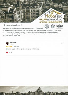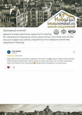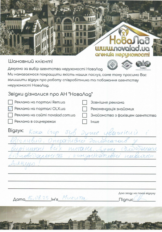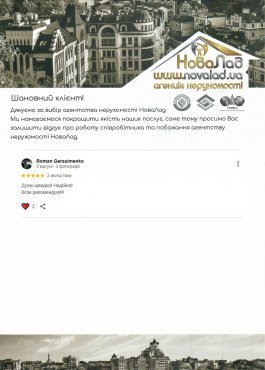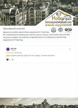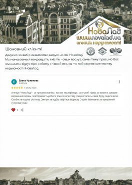 Дуже дякуємо агенції Новалад в допомозі з продажем квартири: професійно та швидко допомогли вирішити всі питання. Особлива подяка рієлтору Дмитру та юристу Сергію.