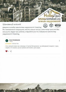 Хочу висловити щиру подяку ріелтору Дмитру та юристу Сергію за їх високий професіоналізм та вміння швидко знаходити покупців. Професійний супровід до та після укладання угоди. В офісі компанії завжди тепла та дружня атмосфера. Хто бажає швидко та вигідно купити/продати нерухомість, однозначно раджу агенцію НоваЛад. Всього Вам найкращого!