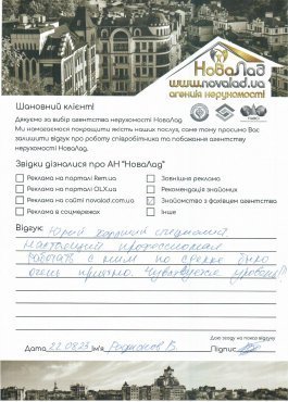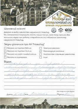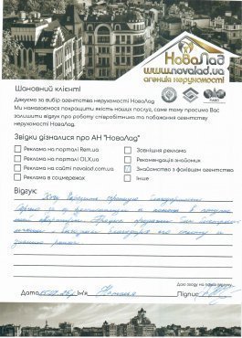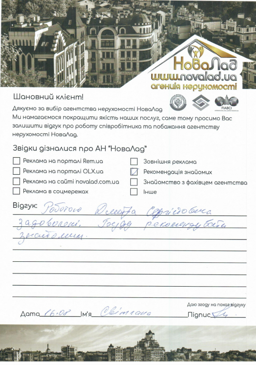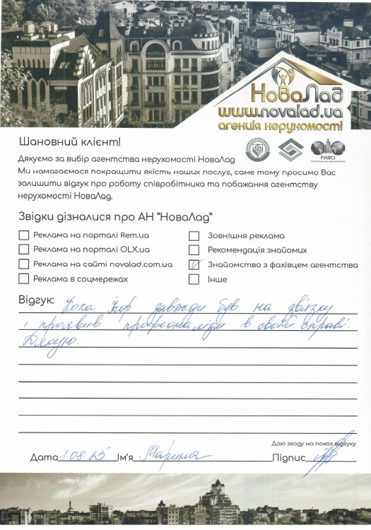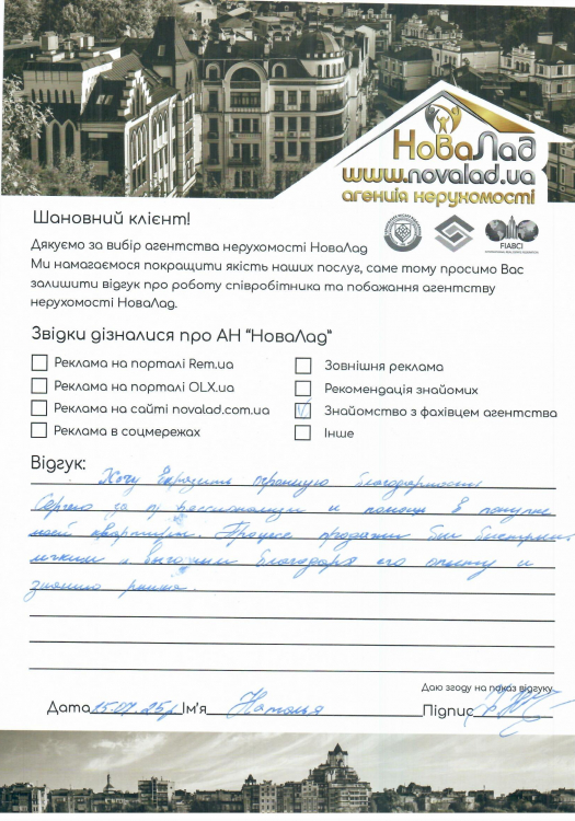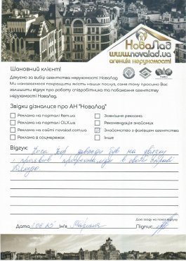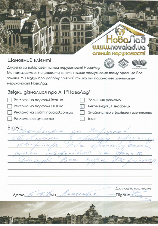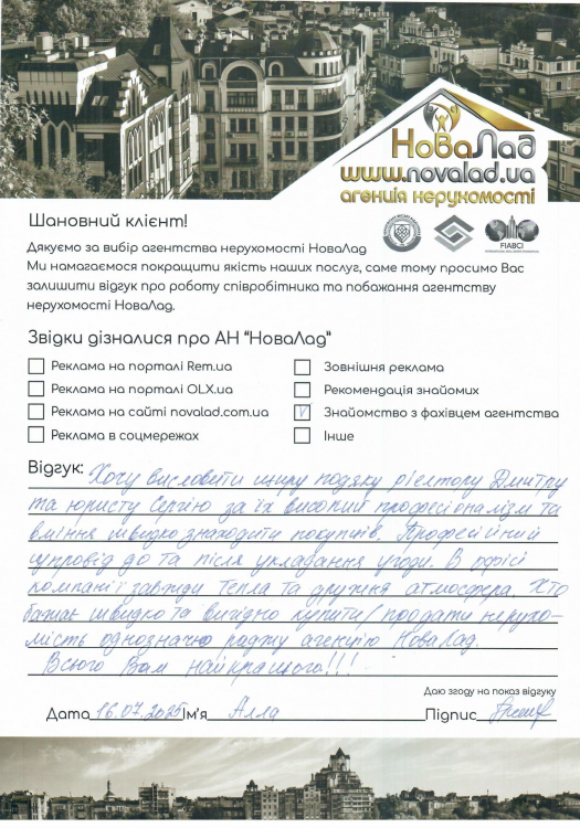 Хочу висловити слова подяки агенції нерухомості НоваЛад, зокрема юристу Сергію за бездоганно проведену роботу з оформленням документів при купівлі квартири.