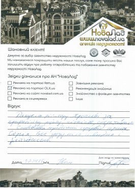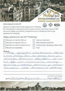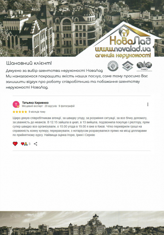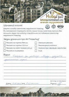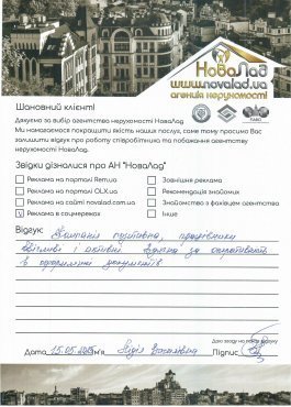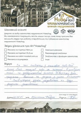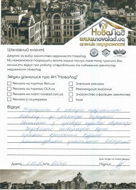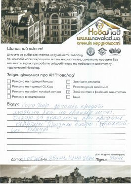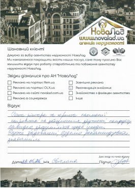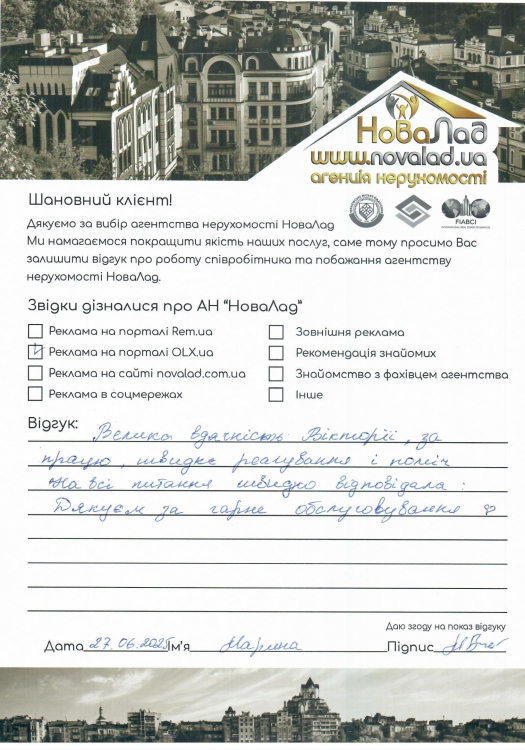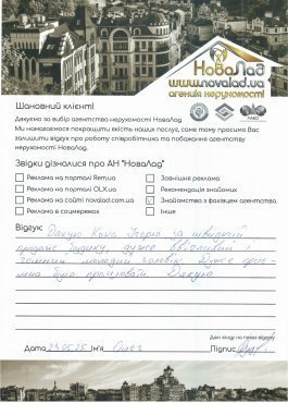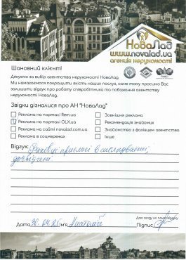 Хочу подякувати працівникам НоваЛад, а саме ріелтору Кока Ігорю, юристу Сергію за оперативне виконання своєї роботи, роз’яснення будь-якої інформації, постійну підтримку з моменту звернення до моменту отримання права власності на квартиру.