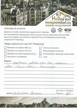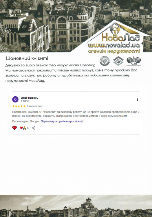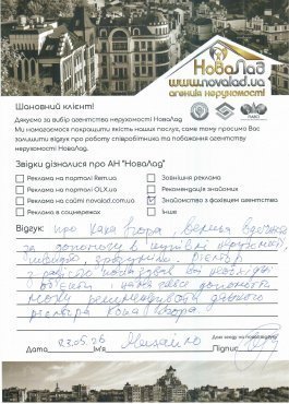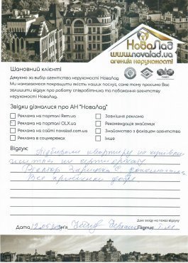 Велика подяка фірмі НоваЛад, особливо Кока Ігорю та Сергію Івановичу за гарне відношення до клієнтів та дуже уважне ставлення до своєї роботи. Буду рекомендувати вашу агенцію всім своїм друзям та знайомим. Ще раз щиро дякую! Гарних вам клієнтів. Хай щастить!