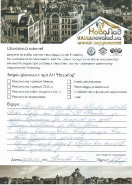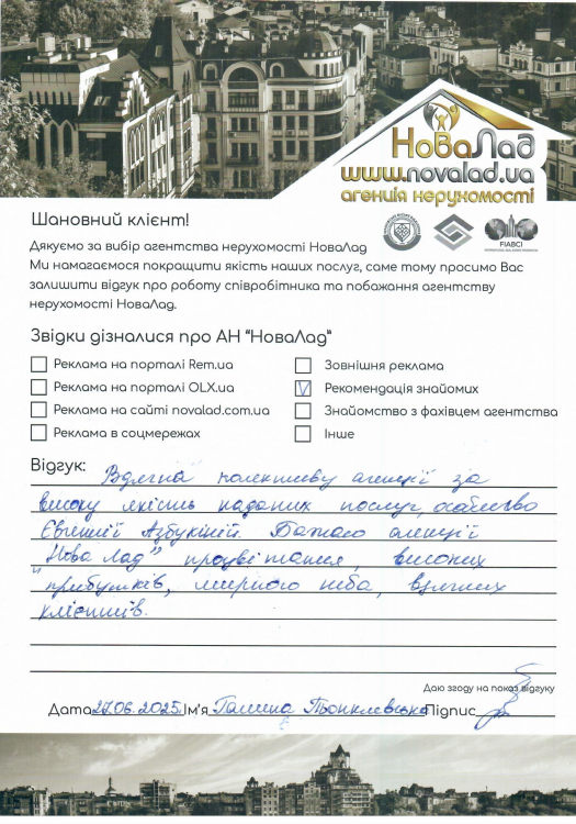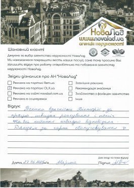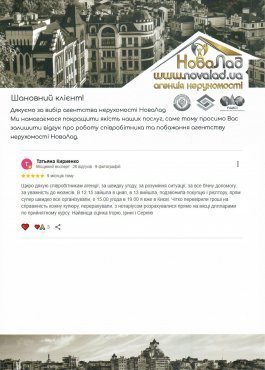 Подяка всій команді АН "Новалад" за виконану роботу, це не просто команда професіоналів-а ще й людей, які допоможуть, порадять, підтримають у потрібний момент. Раджу всім знайомим.