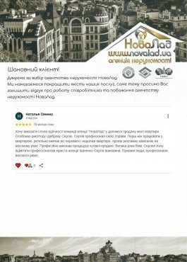 Хочу виказати слова вдячності команді агенції "НоваЛад" у допомозі продажу моєї квартири. Особливо риєлтору Щеброву Сергію. Сергій професіонал своєї справи. Перш ніж працювати з квартирою, ретельно вивчив всі переваги і недоліки квартири, провів рекламну кампанію на високому рівні. Професійно виконав процедуру купівлі-продажі. Велика дяка Вам, Сергію! Хочу відмітити професіоналізм юриста агенції Іваненко Сергія Івановича..Приємні люди, професіонали високого рівня.