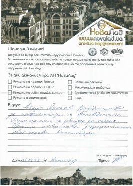 Дякую фахівцям «НоваЛад» за вдале придбання нерухомості. Бажаю успіхів у майбутньому!